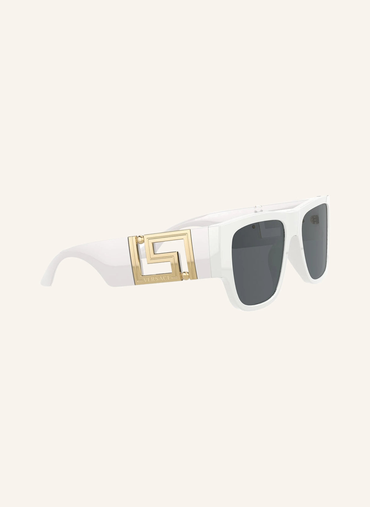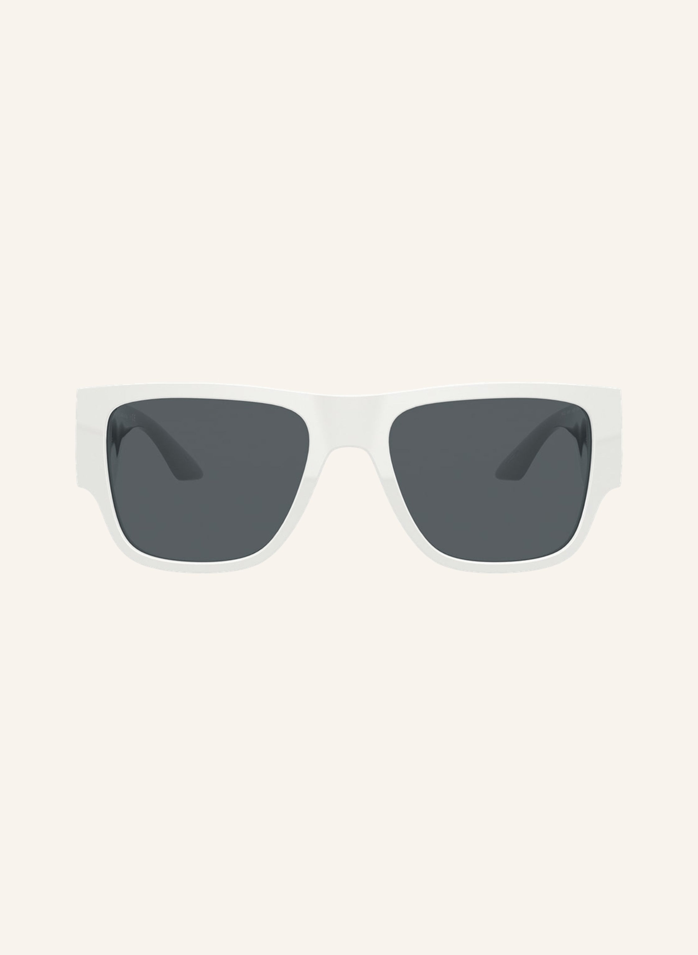 Details: White Versace VE4403 sunglasses and wide fit for larger face shapes. Features the signature Versace emblem on the temples and includes a protective case.